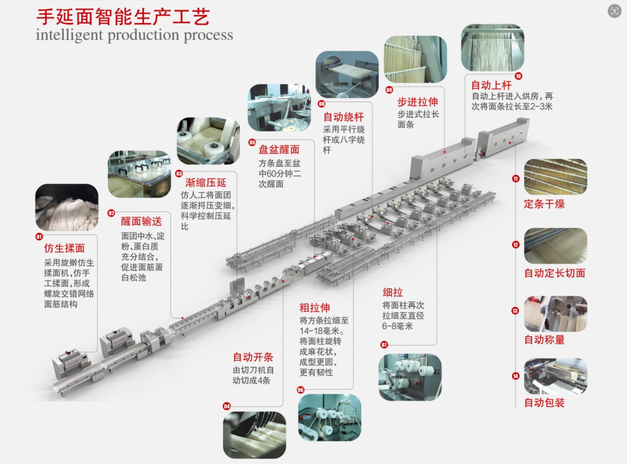同時該產線智能化程度高,產能高效,可實現10-20噸/天的產能,是人工制面效率的8-10倍,是目前產能最大的全自動手延面生產線。